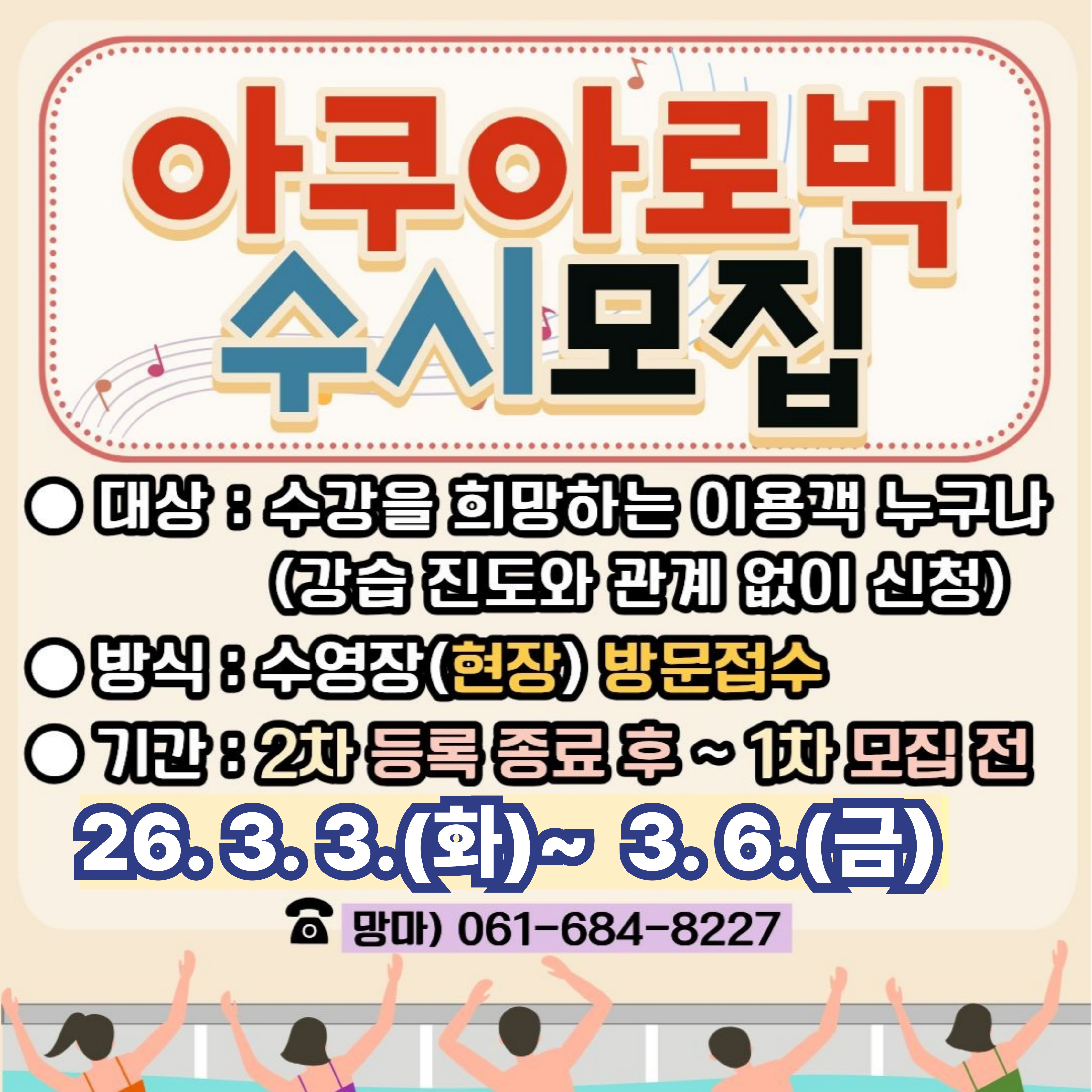 - 망마국민체육센터 아쿠아로빅(화목금) 2026년 03월 강습 추첨 결과안내 2026-02-13